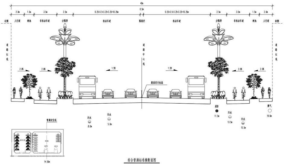 细节方面,项目横断面形式为3.5米人行道+3.5米非机动车道+2.5米侧分带+21米机动车道+2.5米侧分带+3.5米非机动车道+3.5米人行道。设计行车速度包括路段50km/h,交叉口30km/h。