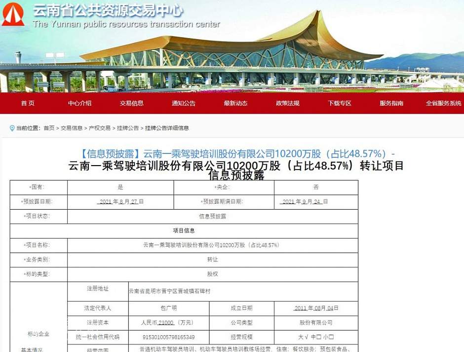 内容显示,云南一乘驾驶培训股份有限公司(下称“一乘驾校”)10200万股(占比48.57%)拟对外进行挂牌转让。值得注意的是,该部分转让股权不仅显示为国有,而且与一乘驾校大股东云南省康旅控股集团有限公司(下称“云南康旅集团”)持股数量及持股比例吻合。