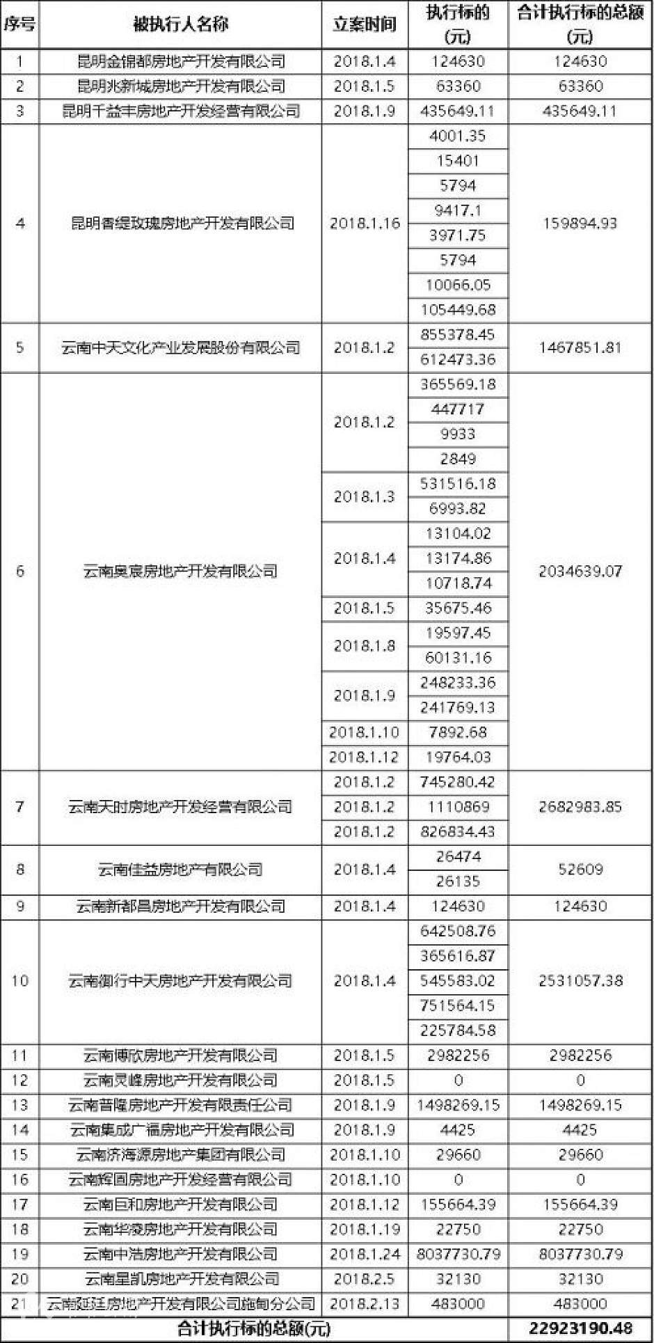 统计数据显示,今年前2个月被列入失信被执行人名单的21家云南本土房企共涉51起失信被执行案件,其中,云南奥宸房地产开发有限公司失信记录最多,共涉16起失信被执行案件,失信执行标的总额合计约203.46万元,若再加上旗下控股的昆明香缇玫瑰房地产开发有限公司涉及的失信被执行案件,奥宸地产今年前两月合计共有24条失信被执行记录;云南中浩房地产开发有限公司虽仅有1次失信被执行记录,但803.77万元的失信被执行标的数额最大;失信被执行标的最低的为云南集成广福房地产开发有限公司,共4425元。
