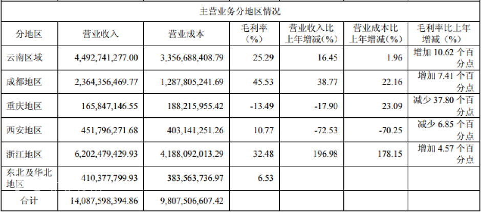 在3月19日晚间,云南城投发布公司2017年年度财报。报告显示,2017年公司全年实现营业收入143.91亿元,较 2016年的97.70亿元上升47.30%。这是云南城投营收首次破百亿,而在公布的数据里我们看到,浙江地区(收购“银泰系”16家公司中,有11家在浙江)贡献的营收高达62亿,是云南城投分地区统计营收中最高的区域,接近总营收的五成。收购“银泰系”的硕果,在当年的质疑声尚未烟消云散之际,亮出了漂亮的数据。