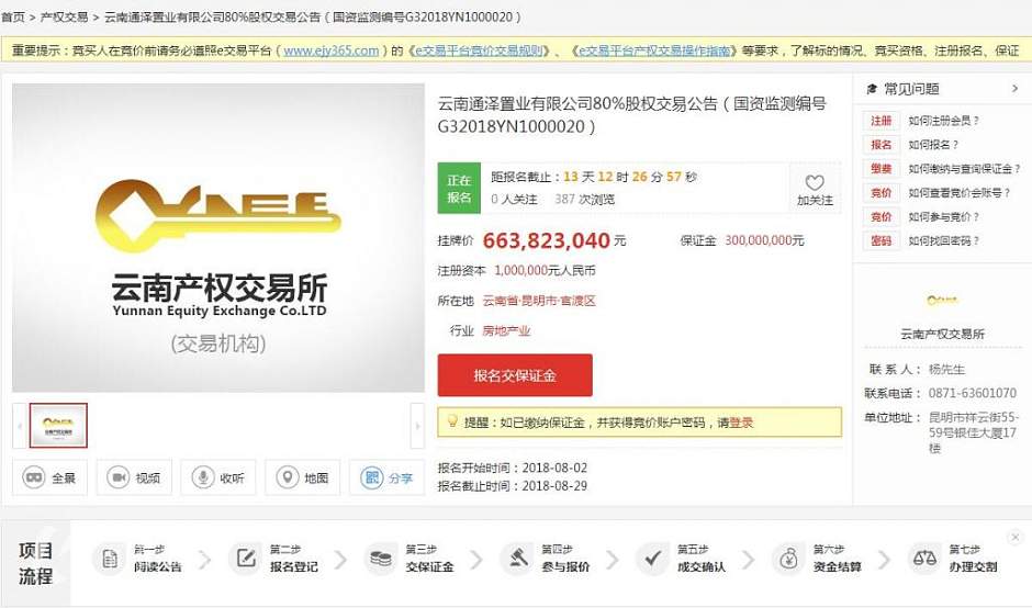 成立仅5个月,云南通泽置业转让80%股权,挂牌底价66382.304万元,旗下持有2宗约243亩国有建设用地。目前,云南通泽置业有限公司80%股权正在云南产权交易所挂牌交易。就在今年的5月29日,成立仅3个月的云南通泽置业就进行了80%股权转让预告。