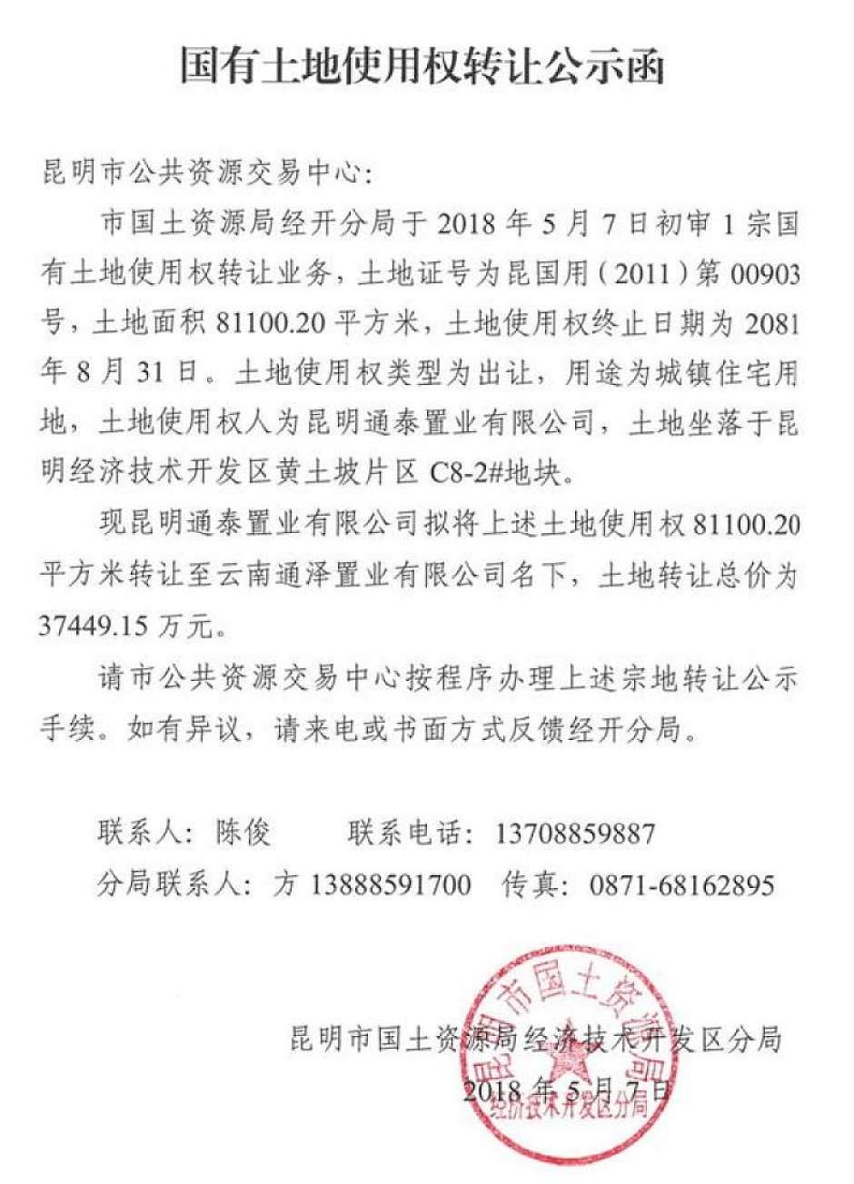 今年5月10日,云南通泽置业曾于通过受让土地的方式,获得2宗坐落于昆明经济技术开发区黄土坡片区编号分别为C8-1#和C8-2#的城镇住宅用地。转让这2宗地块的企业为云南通泽置业的唯一控股股东,昆明通泰置业。