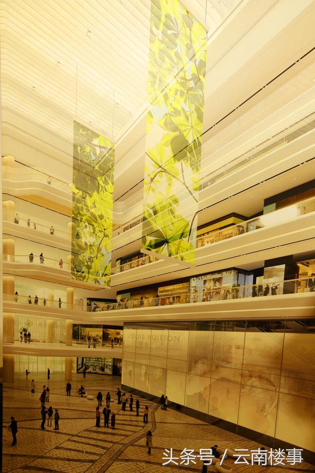 商场中心区域将使用超过 80,000 平方米、足以覆盖超过 11 个足球场的一级天然石材,使整体设计融入到天然的环境当中。另外,其公共区域亦将安装超过 19,000 条的 LED 照明灯线,其长度是昆明长水国际机场跑道长度的4 倍。
