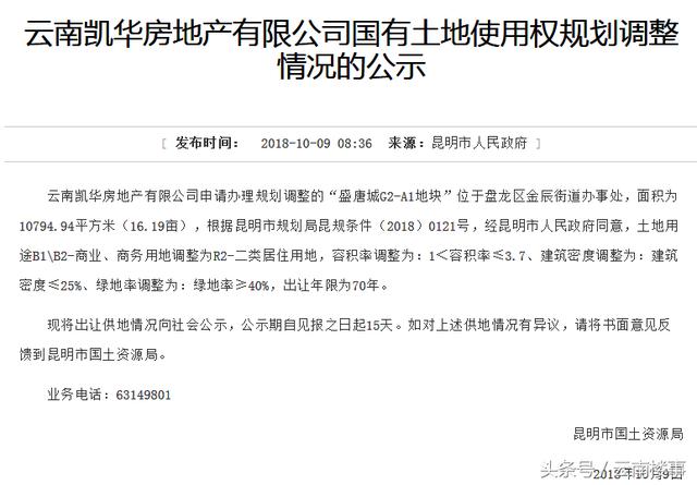 10月9日,昆明市国土资源局公示一则土地用途变更事宜,系云南凯华房地产有限公司国有土地使用权规划调整情况公示,涉及“盛唐城G2-A1地块”的土地用途变更。