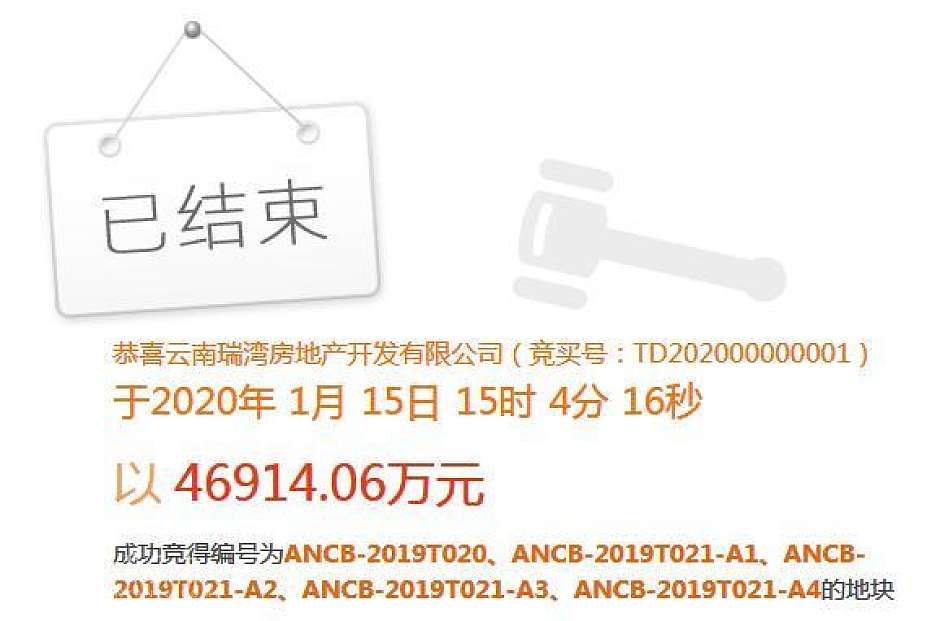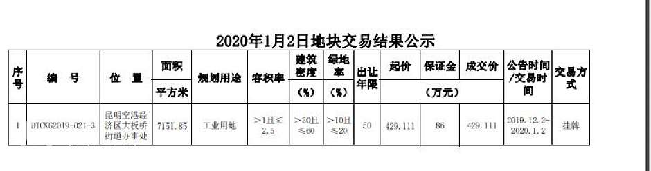 根据昆明市国土资源局土地交易结果显示,1月份昆明土地市场先后于2日和9日、15日、17日以现场挂牌及网上拍卖等方式顺利出让10宗国有建设用地,其中,昆明主城仅有1宗工业用地成交,也是昆明主城1月唯一成交的土地,该地块位于昆明空港经济区大板桥街道办事处,成交总面积7151.85平方米、约10.73亩,总成交价429.111万元,由昆明市官渡区天森木业制作厂竞得。