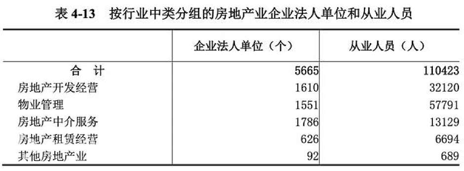 累计从业人员110423人,比2013年末增长40%。其中,房地产开发经营企业32120人,物业管理企业57791人,房地产中介服务企业13129人,分别2013年末增长5.0%、58.5%和88.1%。