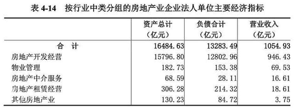 按照行业不同业务类型划分,房地产开发经营企业资产总计15796.80亿元,负债合计12802.96亿元,负债率81.05%;物业管理企业资产总计182.73亿元,负债合计153.38亿元,负债率83.9%;房地产中介服务企业资产总计68.59亿元,负债合计28.11亿元,负债率40.98%;房地产租赁经营企业资产总计306.28亿元,负债合计214.32亿元,负债率69.98%;其他房地产业企业资产总计130.23亿元,负债合计84.72亿元,负债率65.05%。