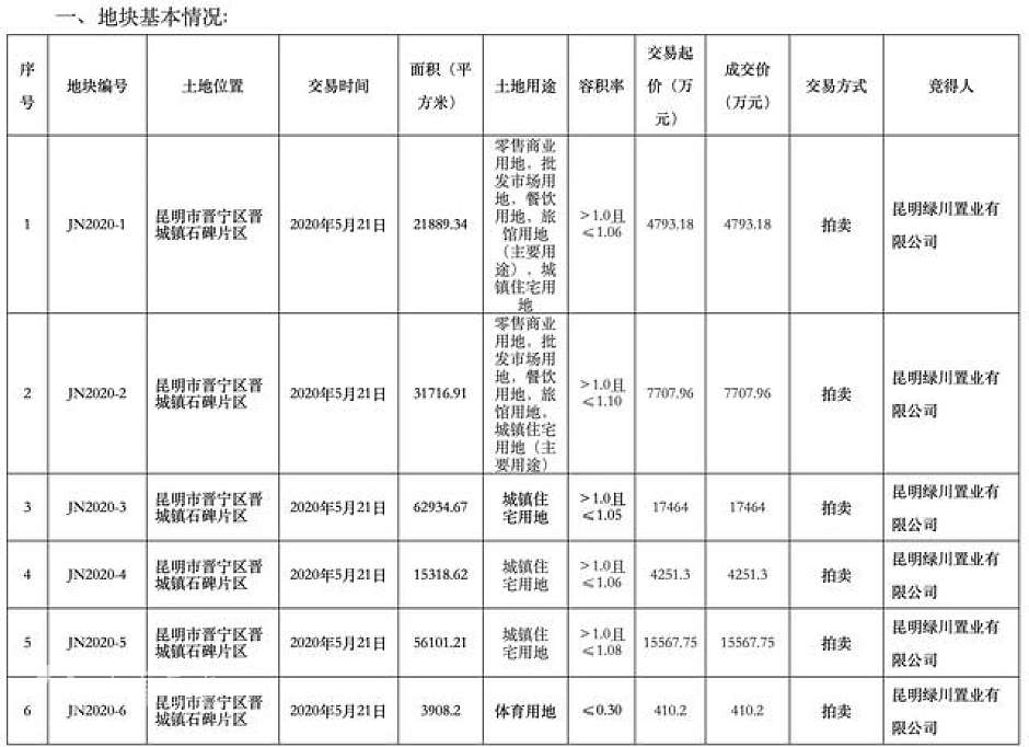 土地成交信息显示,绿地香港竞得的6宗晋宁区地块编号分别为JN2020-1、2、3、4、5、6号,位于昆明市晋宁区晋城镇石碑片区,面积合计191868.95平方米、约合287.79亩。其中,1、2号地块为商业用地,面积合计53606.25平方米、约合80.41亩;3、4、5号地块为住宅用地,面积合计134354.5平方米、约合201.52亩;6号地块为体育用地,面积3908.2平方米、约合5.86亩。