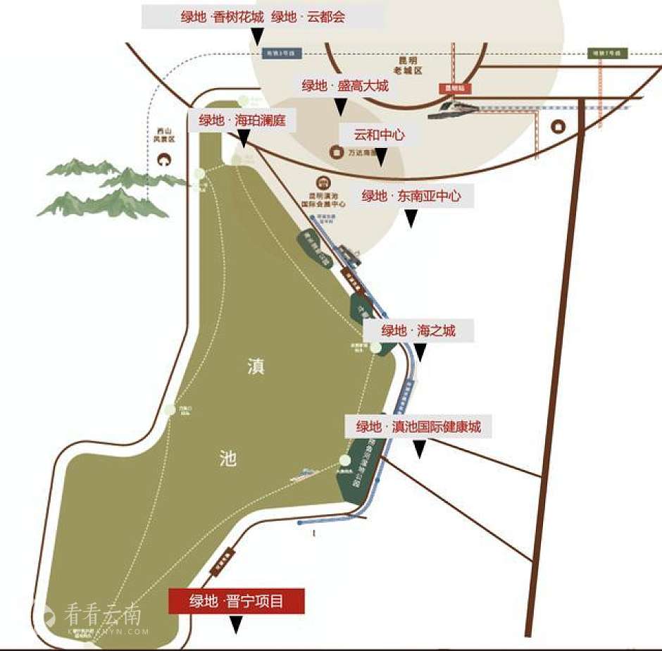 根据地块位置,绿地香港晋宁项目位于昆明市晋宁区滇池南岸,距离滇池直线距离约5km,享有古滇文化公园、古滇湿地公园、盘龙寺等丰富的景观旅游资源以及昆磨高速、绕城高速、晋江高速(规划建设中)、马余高速(规划建设中),轨道地铁9号线等交通资源。