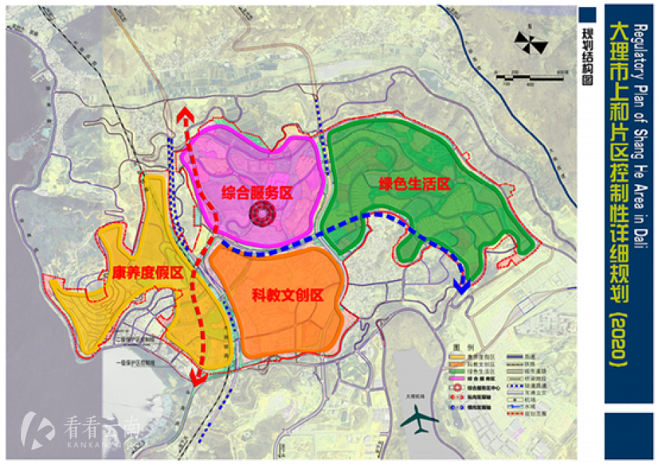 根据规划,上和片区总用地面积9.6平方公里(约14400亩),城市建设用地面积9.17平方公里(约13755亩),规划定位是以行政办公、教育科研、生态旅游、文创康养为主的综合功能片区。规划结构为“一心两轴四片区”。