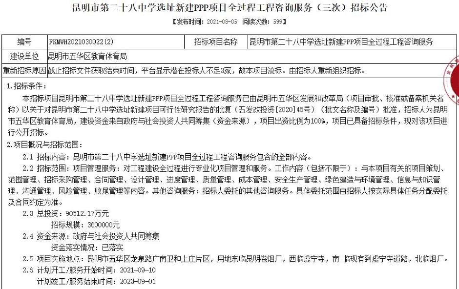 直到近日,“昆明市第二十八中学选址新建PPP项目全过程工程咨询服务招标公告”第三次被发布出来才知,该招标此前已历经两次流标。