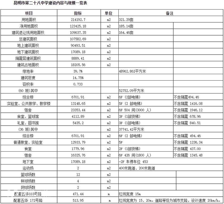 36班初级中学新建综合楼约0.67万方;普通教室、实验室合计约1.29万方;食堂约0.18万方;宿舍约1.63万方。另配套两条市政道路,五华183号路道路全长471.44米,红线宽度15米;五华172号路全长513.95米,红线宽度为15-20米,道路等级为城市支路,设计速度20km/h。