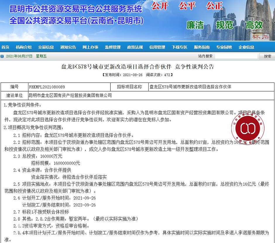近日,昆明盘龙区578号城市更新改造项目选择合作伙伴的竞争性谈判公告发布,内容显示,项目位于茨坝街道办事处辖区范围内盘龙区578号周边可开发用地,总面积约87亩,总投资约16亿元,成交人参与盘龙区578号城市更新改造土地一级开发整理项目工作。