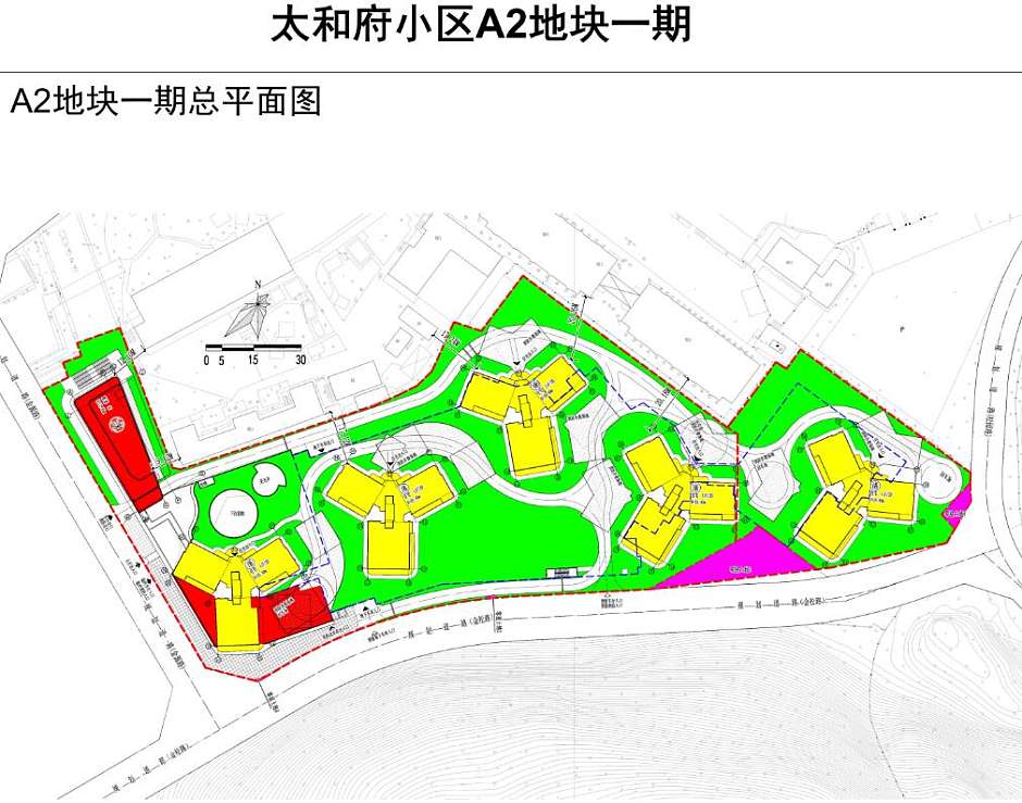 据规划,太和府小区A2地块一期范围内因南侧规划道路部分路段(金松路)目前暂时不具备实施条件,故过渡期内将A2地块一期车行入口临时设置于西侧规划道路(金源路);小区南侧预留一个小区入口和一个车库入口,待后期规划道路(金松路)建设后可投入使用。