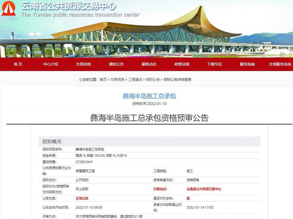 日前,云南省公共资源交易中心官网发布了“彝海半岛施工总承包资格预审公告”。内容显示,彝海半岛施工总承包项目标段合同估算价约1.02亿元,建设规模约2.73万方,建设单位为云南省城乡建设投资有限公司(下称“云南城乡投”),计划工期为360日历天。此次资格预审采用有限数量制,通过家数为11家。