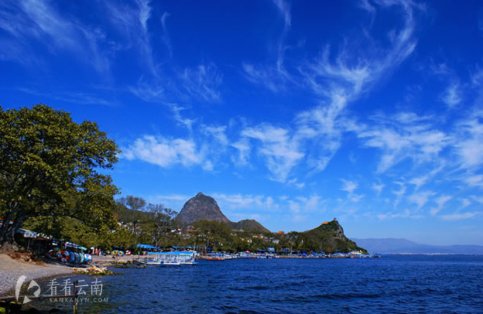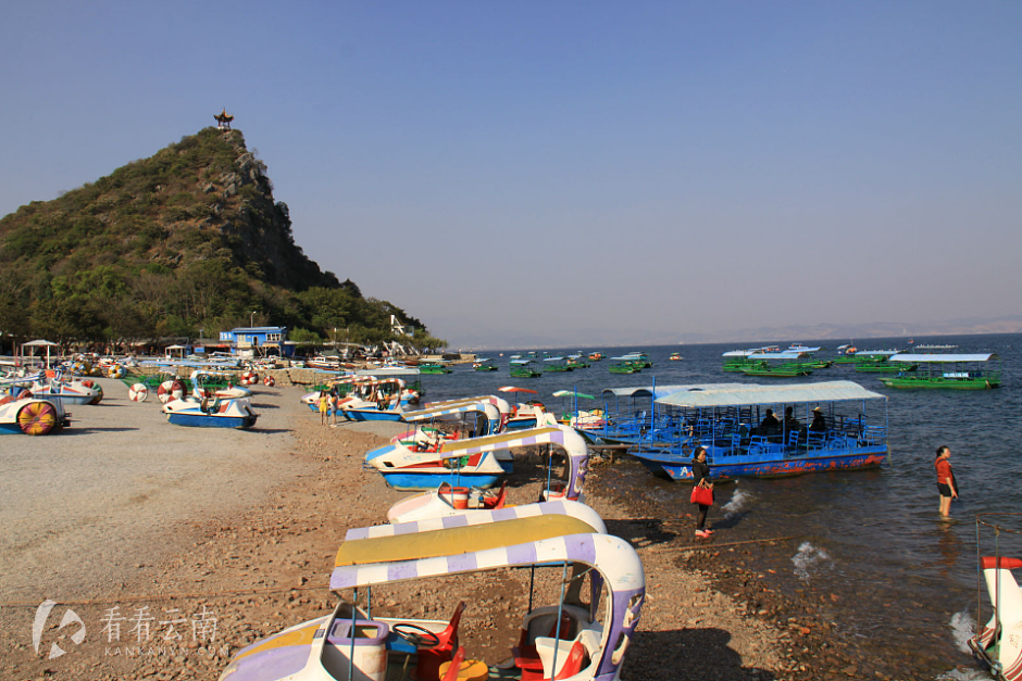 抚仙湖环湖沿岸都是观看风景的景点,自然也就分布着占据地理便利的当地居民开办的餐饮住宿店。零星几个上规模的旅游服务点,比如月亮湾湿地公园、樱花谷、希尔顿、阳光海岸孤山景区、九龙晟景、明星渔洞、禄充,一片沙滩,或者几艘船,充其量水上单车和生意冷淡的帆船,算得上比较有档次的水上娱乐项目。