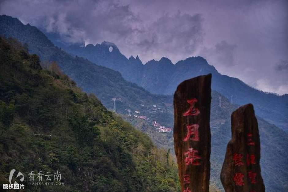 远处的那个天然孔洞,正是被誉为三江圣地、傈僳之根的怒江“石月亮”。据讲解,石月亮所在的山名叫月亮山,海拔约4000米左右,顶部有一个天然孔洞,宽32.7米,高60米,深20米,呈椭圆形,群峰簇拥,高悬于峰海山林之中,是怒江大峡谷的奇景之一。