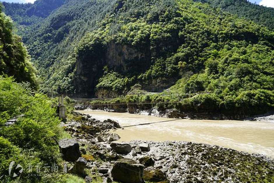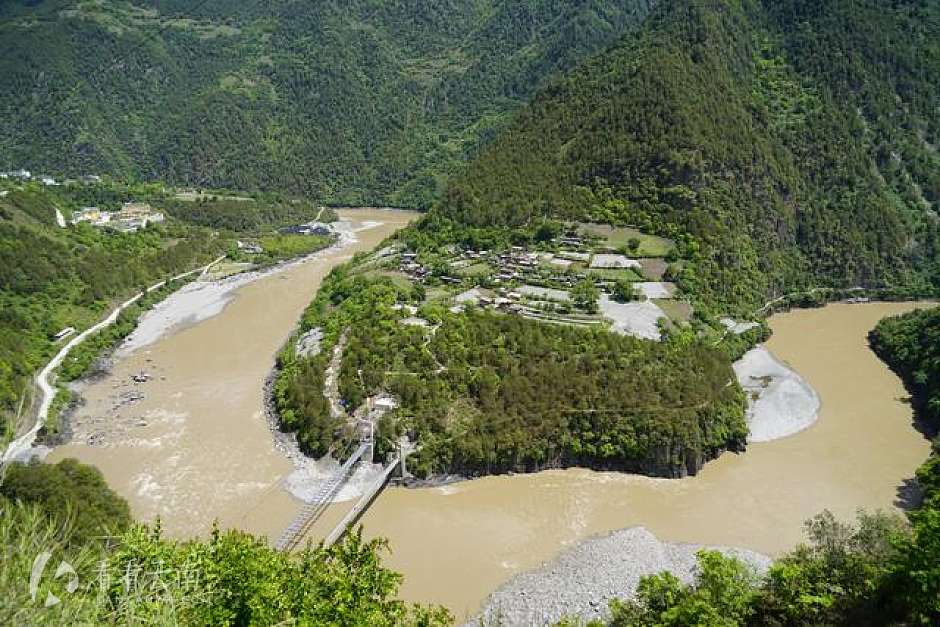 怒江发源于唐古拉山,流经丙中洛乡时被悬崖阻隔了,这条河不得不由北向南,由东向西流,流出300多米后,又被山体阻挡,不得不再次自西向东掉头。湾中心有一个村子叫坎桶村,这里江面海拔1710余米,气势磅礴,湾上怒江台地平坦开阔,高出怒江500米,构成三面环水的半岛状小平原。小平原四周景物宜人,田如棋盘,每到农闲季节或节假日,人们便到这里泛舟过溜,对歌起舞,坎桶村堪称峡谷桃源,处处是田园风光。