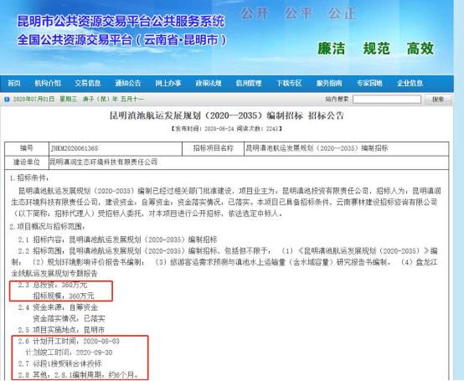 近日,昆明市公共资源交易中心发布“昆明滇池航运发展规划(2020–2035)编制”招标公告,公共显示,该规划编制总投资约360万元,编制周期约6个月,项目由昆明滇池投资有限责任公司(下称“昆明滇投公司”)主要负责建设。这意味着,滇池航运工程将取得又一步突破性进展。