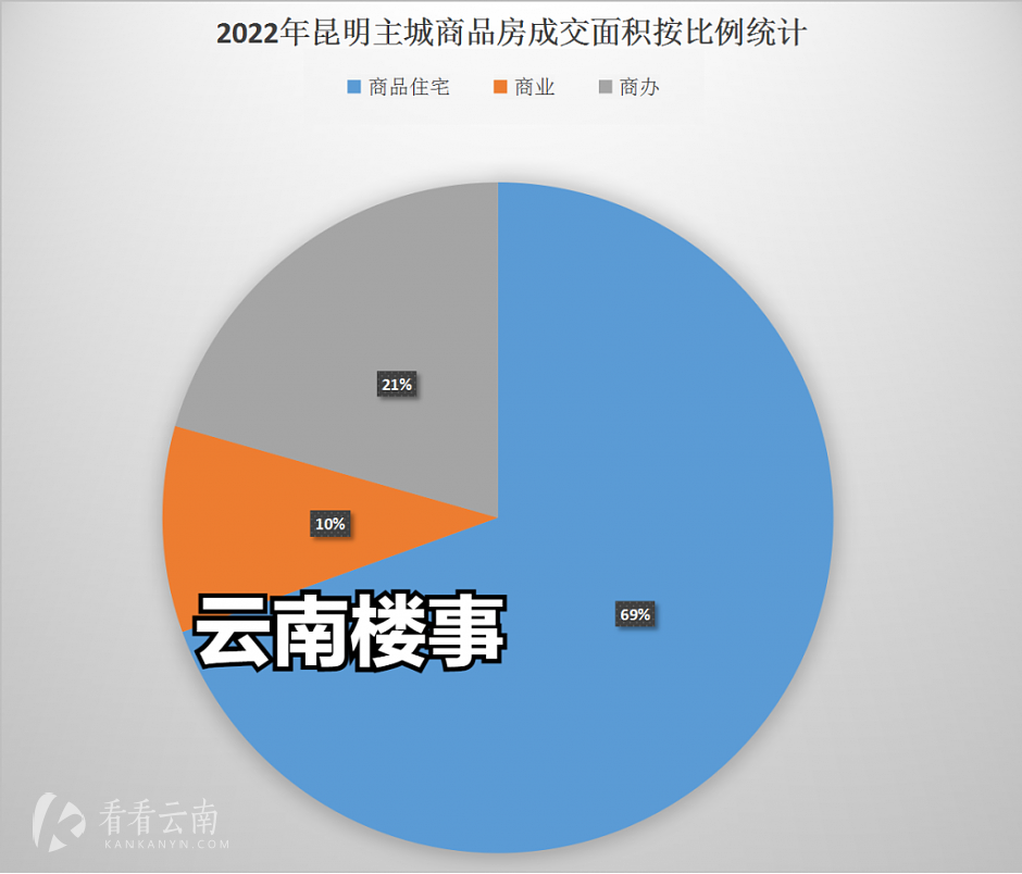 解析2022年昆明主城607.5万㎡的商品房成交面积数据,这里包含商品住宅成交面积422万㎡、商业成交面积60.4万㎡、公寓和写字楼成交面积125.1万㎡,商品住宅、商业、商办占比是:69%:21%:10%。